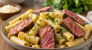 Keywords: creamy pasta, beef pasta, high protein recipe, quick dinner, family meal